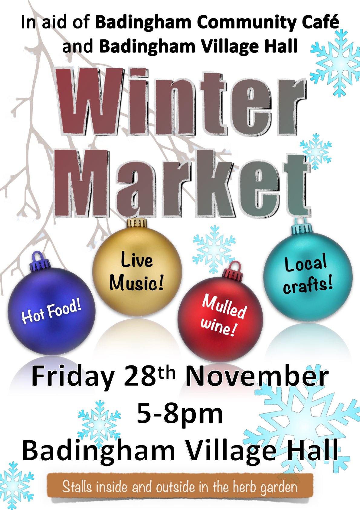 The Winter Market will be held in the Village Hall again this year. We plan to have stalls inside and out along with festive music, mulled wine, hot food, tea & coffee. Stalls can be booked at a cost of £10 via badinghamwintermarket@gmail.com